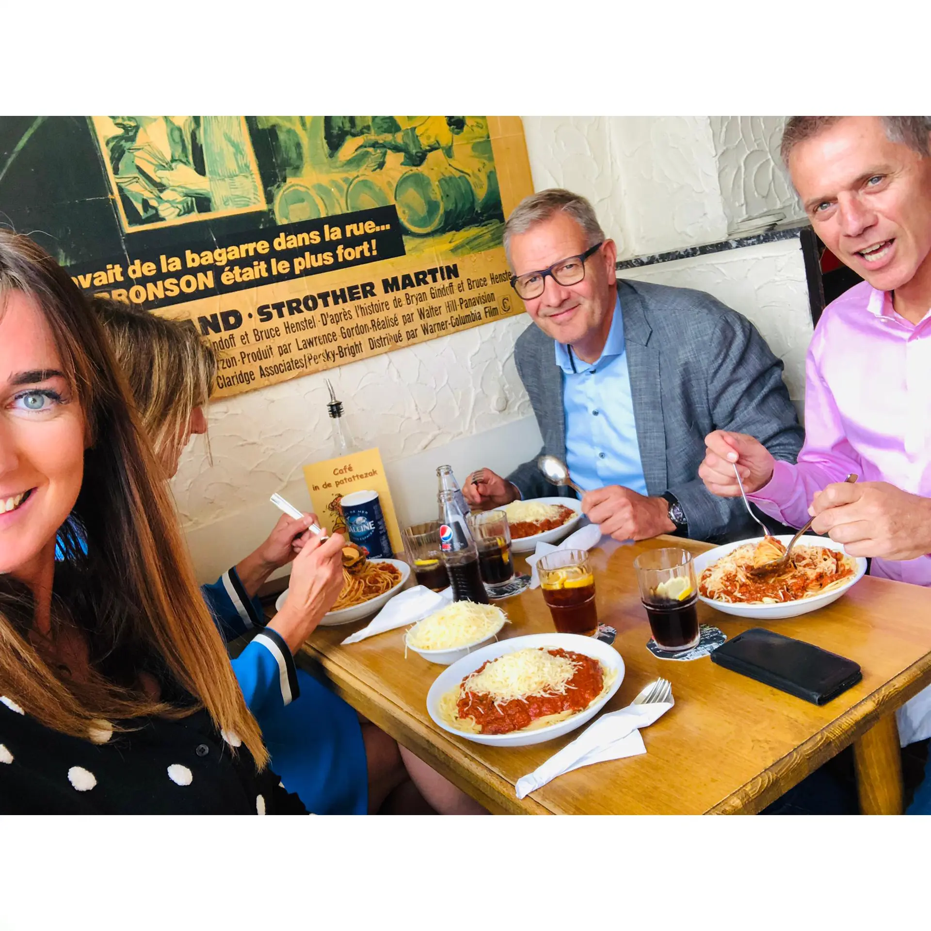 De tijd vliegt, lunch time! Vandaag ga ik met enkele collega’s een lekkere spaghetti met veel kaas eten. Ik eet heel graag pasta, mijn lunch smaakt!