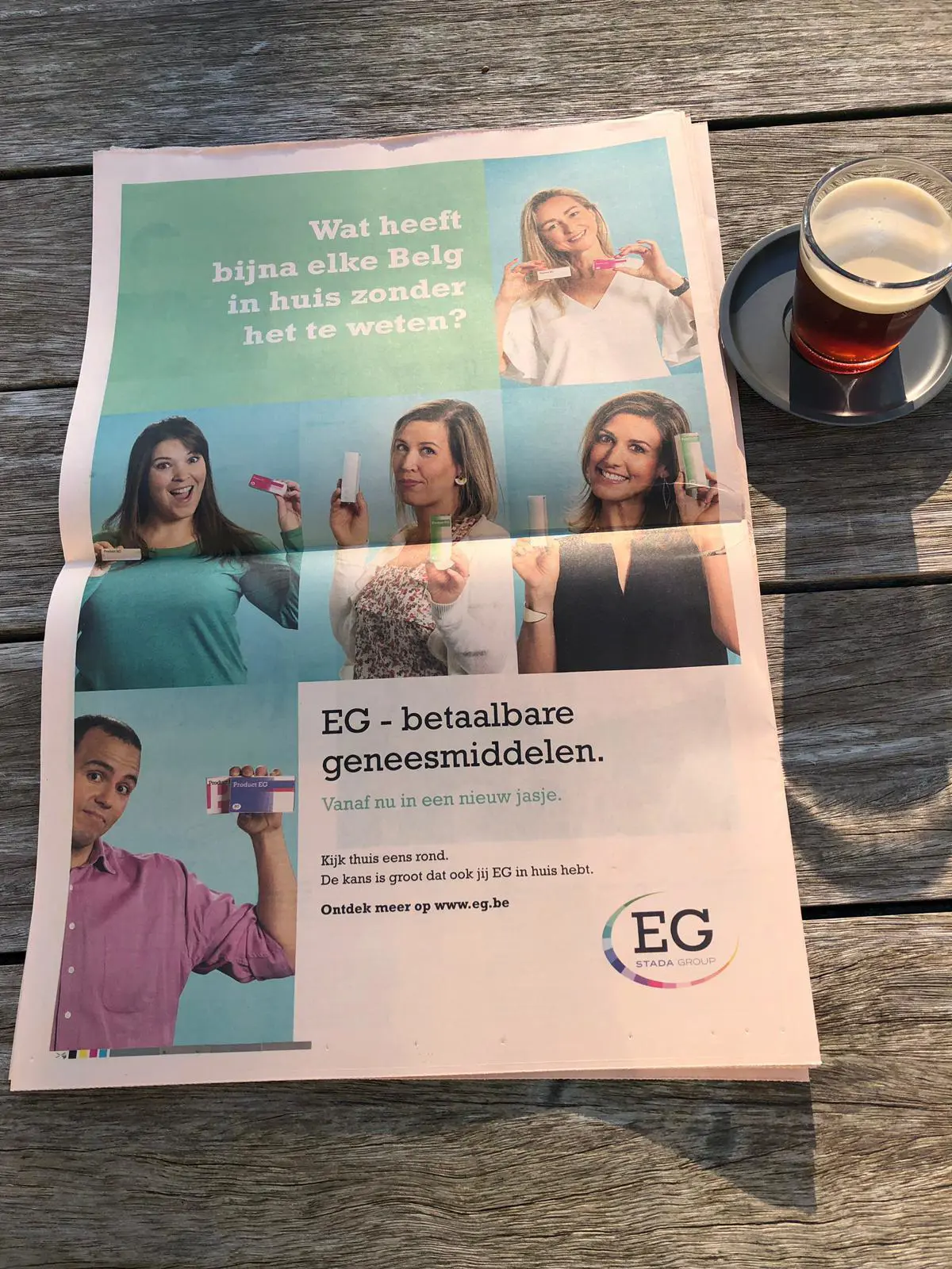 Hoewel bijna elk Belgisch gezin EG in huis heeft, is EG nog weinig bekend bij de Belgen. Vandaar dat we in oktober vorig jaar gestart zijn met onze campagne rond “Wat heeft elke Belg in huis – EG betaalbare geneesmiddelen”. Ondertussen hebben onze EG geneesmiddelen een nieuwe verpakking, voor ons hét moment om een nieuwe communicatie op te starten met de oude en nieuwe verpakkingen. Toen we een oproep deden om enkele collega´s te vinden die model wilden staan voor deze campagne, reageerde hier ruim de helft van onze collega´s positief op. Dit typeert ons bedrijf: bij EG zijn we een hecht team dat achter onze producten staan, en de bijdrage van onze collega´s aan deze campagne is hier een prachtig voorbeeld van.