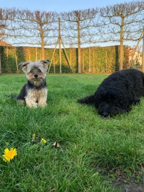Je joue un peu dans le jardin avec nos deux mascottes.