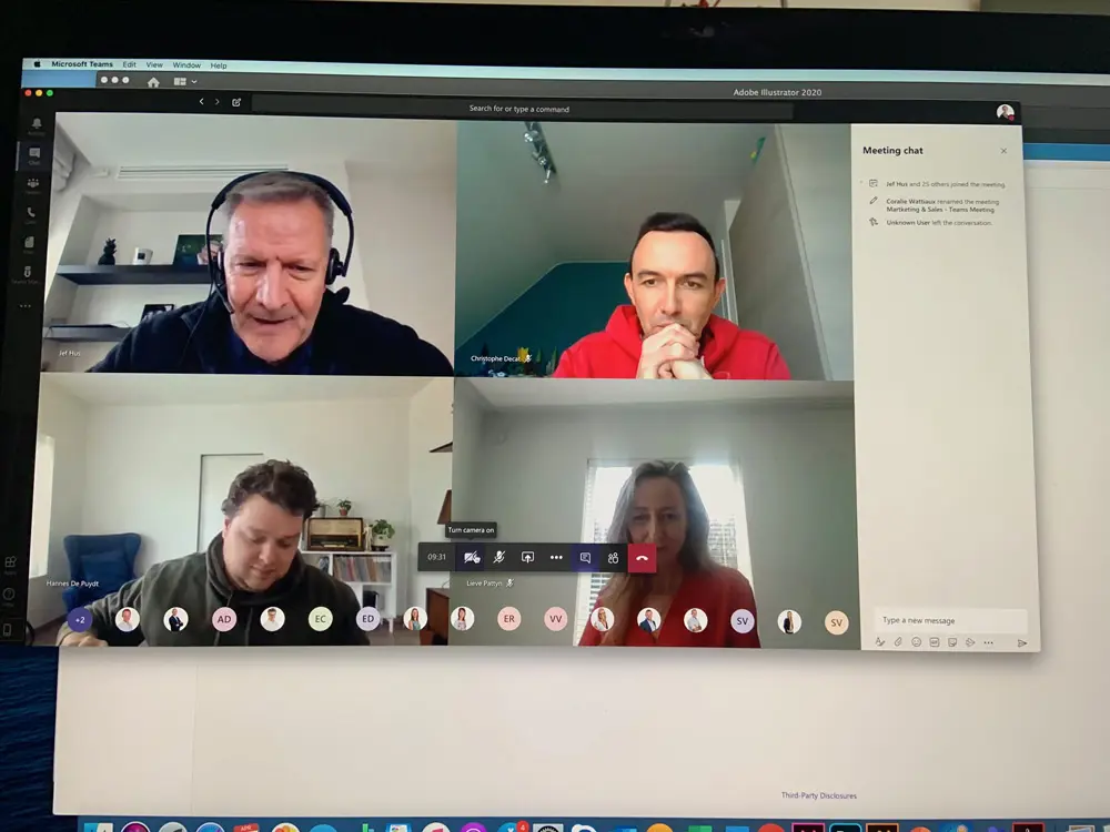 Sur le planning, une réunion virtuelle d’équipe avec Jef. Toute l’équipe marketing et sales est présente ; c’est chouette de revoir tout le monde ! Heureusement, il fait beau et les enfants peuvent jouer dehors. Pendant qu’ils s’amusent dans le jardin, je peux suivre la réunion en toute tranquillité.