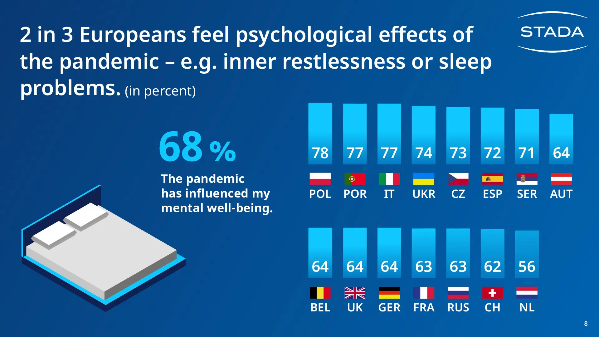 30.000 respondenten, 15 landen, 34 vragen: Het STADA-gezondheidsrapport 2021 is het meest uitgebreide gezondheidsonderzoek tot nu toe. Uitgevoerd tijdens één van de vreemdste en meest turbulente periodes in de recente geschiedenis, wilden we bij de Europeanen nagaan wat hen heeft beziggehouden tijdens de pandemie. Wie vertrouwen ze als het om gezondheid gaat? Is hun houding tegenover gezondheid en gezond leven veranderd als gevolg van Covid?