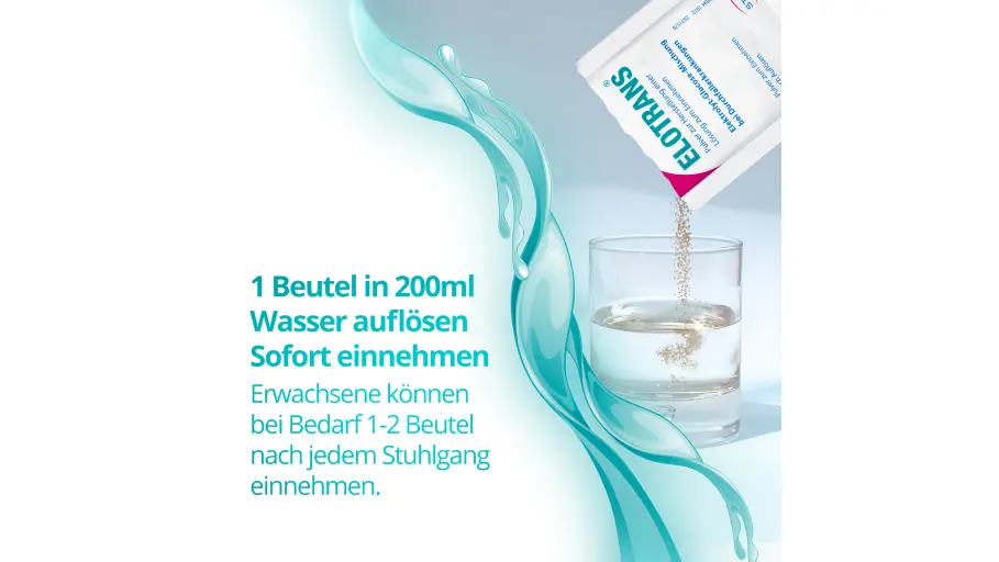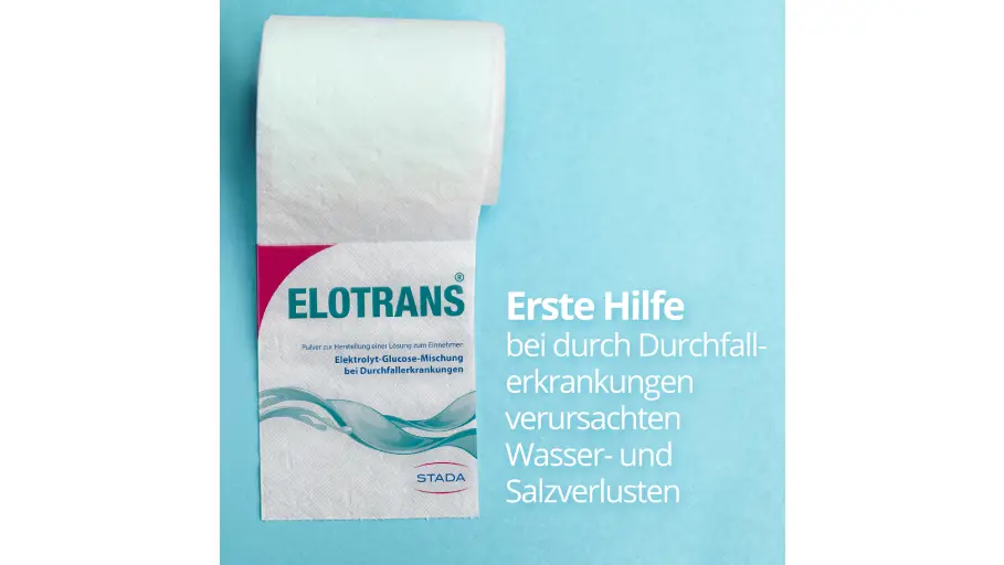 Diarrhoea is a common cause of a lack of fluids and minerals in our body. In order to compensate for these deficiency symptoms, electrolyte solutions such as ELOTRANS® powder are suitable. Also, take electrolyte solutions such as ELOTRANS® powder to protect the body from dehydration (dehydration). The ELOTRANS® electrolyte solution contains an advantageous ratio of glucose (sugar) and mineral salts. One sachet of ELOTRANS® powder (6.03 g) contains: