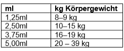 Art der Anwendung: Zum Einnehmen. Nur zur kurzzeitigen Einnahme bestimmt. Die Flasche muss vor dem Gebrauch kräftig geschüttelt werden. Zur genauen Dosierung liegt der Packung eine Applikationsspritze mit einer der folgenden Tabelle entsprechenden Graduierung bei.