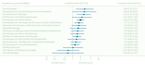- Höheres Risiko für milde bis moderate Nebenwirkungen mit medizinischem Cannabis (818 berichtete Nebenwirkungen unter Cannabis vs. 571 unter Kontrolle; Incidence Rate Ratio: 1,73), mediane Inzidenzrate: