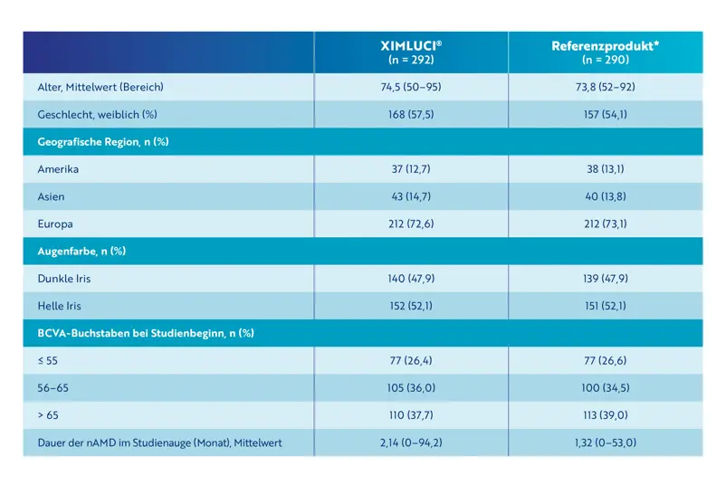 Die Ausgangswerte der in der XPLORE-Studie randomisierten Patienten† waren in beiden Studienarmen ausgewogen. Die kurze Dauer der nAMD zeigt, dass es sich bei der Studienpopulation überwiegend um neu diagnostizierte Patienten handelte.1
