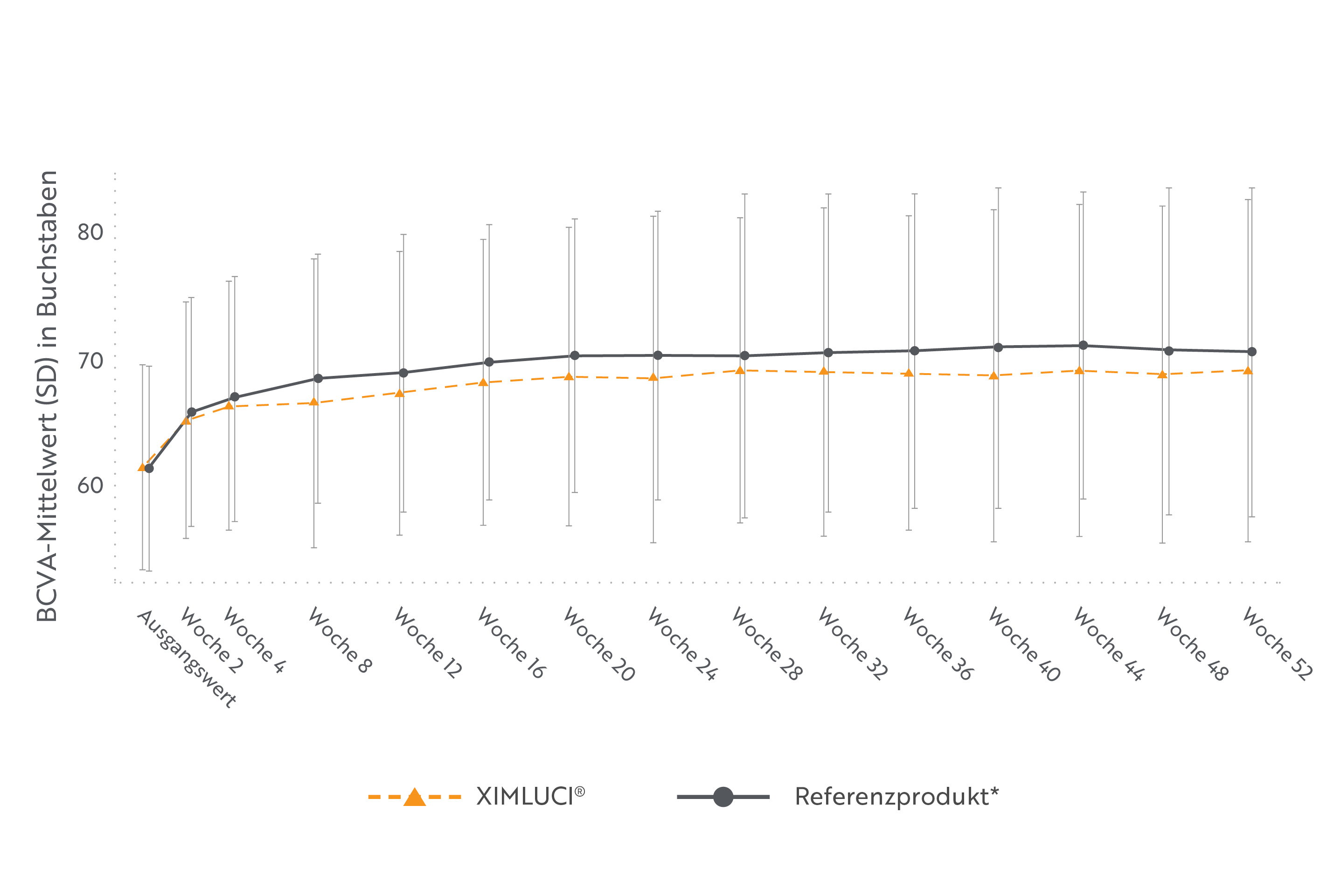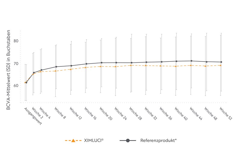 Auch die absolute Anzahl von BCVA-Buchstabenwerten war vergleichbar mit dem Referenzprodukt* und XIMLUCI® zeigte eine anhaltende Verbesserung der Sehschärfe über 52 Wochen1.