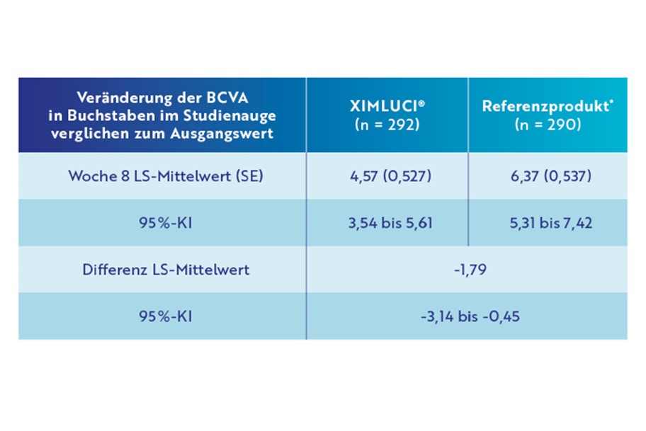 Der primäre Endpunkt der XPLORE-Studie war die Veränderung der bestmöglich korrigierten Sehschärfe (BCVA) zwischen Ausgangswert und Woche 8.1†‡ Die vergleichbare Wirksamkeit von XIMLUCI® und dem Referenzprodukt* konnte nachgewiesen werden.