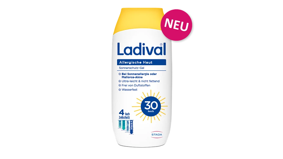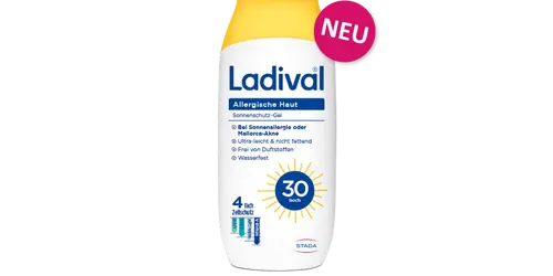 Ladival® Allergische Haut ist der ideale Sonnenschutz für alle Personen, die zu allergischen Hautreaktionen in der Sonne neigen. Die leichten Hydrodispersionsgele auf Wasserbasis enthalten weder Fette noch Emulgatoren – die häufigsten Auslöser für die wohl bekannteste Form der Sonnenallergie, die so genannte „Mallorca-Akne“. Juckende Bläschen und Quaddeln in der Sonne können so vermieden werden. Dabei unterscheiden sich die Produkte der Serie Ladival® Allergische Haut optisch und kosmetisch nicht von einer normalen Sonnenschutzlotion. Ladival® Allergische Haut Sonnenschutz Gel lässt sich leicht verteilen, zieht schnell ein und hinterlässt ein angenehmes Hautgefühl.