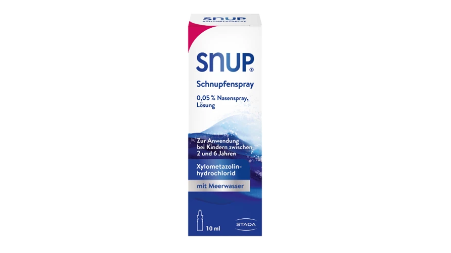 Anwendungsgebiet(e): Zur Abschwellung der Nasenschleimhaut bei Schnupfen, anfallsweise auftretendem Fließschnupfen (Rhinitis vasomotorica), allergischem Schnupfen (Rhinitis allergica). SNUP® Schnupfenspray 0,05% ist für Kinder zwischen 2 und 6 Jahren bestimmt.