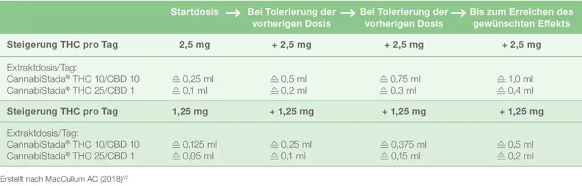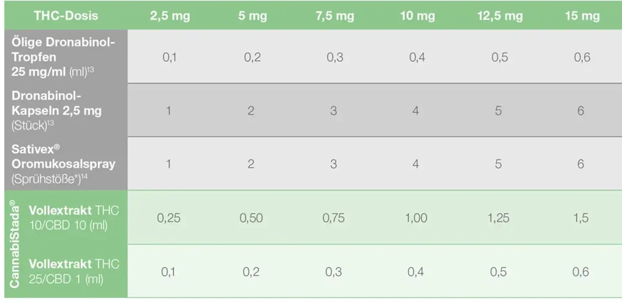 Sollen Patienten auf ein CannabiStada®-Vollextrakt umgestellt werden, können Dosierungen aus folgendem Vergleichsschema angewandt werden:
