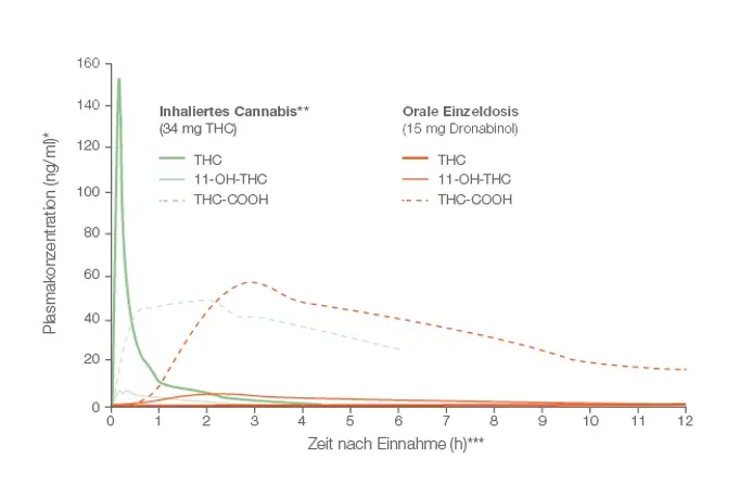 Bei oraler Aufnahme sollte außerdem berücksichtigt werden, dass THC ein sehr variables inter- und intraindividuelles pharmakokinetisches Profil aufweist, das ebenfalls stark von der Darreichungsform abhängt.10