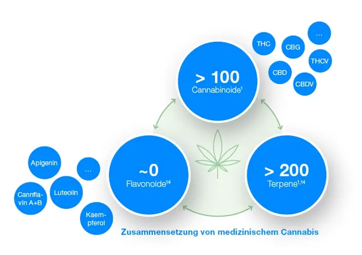 Bei bestimmten Darreichungsformen (z. B. Vollextrakt und Blüten) kann man von diesem Effekt profitieren. Über 100 derzeit bekannte Cannabinoide entfalten ihre therapeutische Wirkung durch Interaktion mit dem Endocannabinoidsystem, dazu kommt die Wirkung von über 200 Terpenen.1,14 Darüber hinaus sind ca. 20 Flavonoide, also Pflanzenfarbstoffe und Antioxidantien mit therapeutisch vielfältiger Wirkung in medizinischem Cannabis enthalten.14