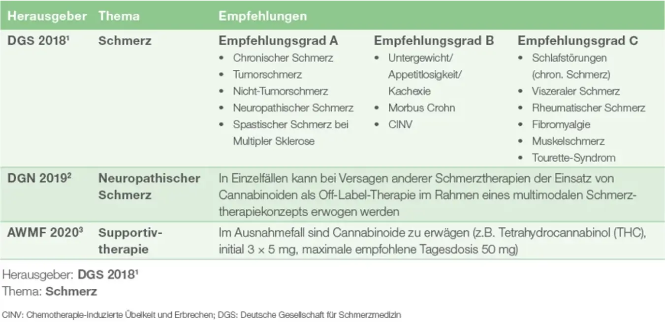 Die Deutsche Gesellschaft für Schmerzmedizin (DGS) hat im Jahr 2018 eine Praxisleitlinie für den Einsatz von medizinischem Cannabis in der Schmerztherapie veröffentlicht. In dieser plädiert sie für eine patientenzentrierte Herangehensweise im Umgang mit medizinischem Cannabis und erklärt, dass diese symptomorientiert sein muss. Somit berücksichtige die Praxisleitlinie neben der externen Evidenz auch die interne Evidenz durch die Erfahrungen der Patienten. Für viele Schmerzarten wurde der Empfehlungsgrad A ausgesprochen.1