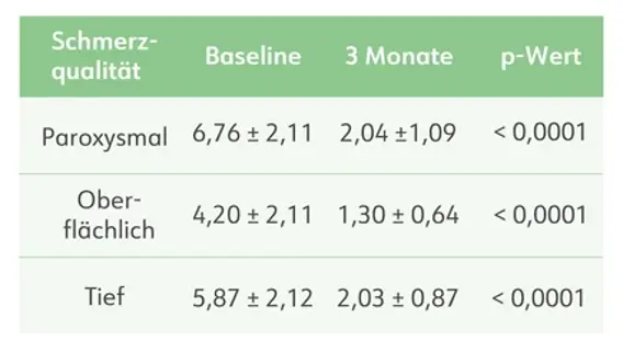 Signifikante Verbesserung aller Schmerz-Deskriptoren (PQAS; paroxysmal, oberflächlich, tief, unangenehm; p < 0,0001)