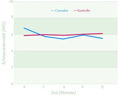 - Signifikante Verbesserung der durchschnittlichen Schmerzintensität (Veränderung Cannabis vs. Kontrolle: 0,74 Punkte)