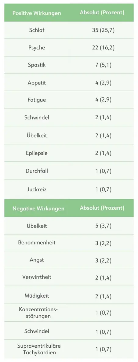 - Medizinisches Cannabis war im Allgemeinen gut verträglich, anfängliche Nebenwirkungen waren u. a. trockener Mund, Schwindel und vermehrter Appetit