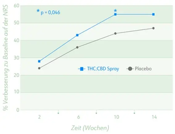 - Aber: Signifikanter Unterschied zugunsten von THC:CBD-Extrakt bei einer Interimsanalyse in Woche 10 (p = 0,046, s. Abb.)