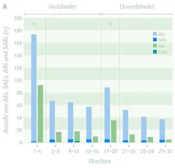 Zeitverlauf des Auftretens von (schwerwiegenden) Nebenwirkungen und (schwerwiegenden) unerwünschten Reaktionen im Dronabinol-Arm (A) und im Arm, der 16 Wochen Placebo und im Anschluss Dronabinol erhielt (B ).