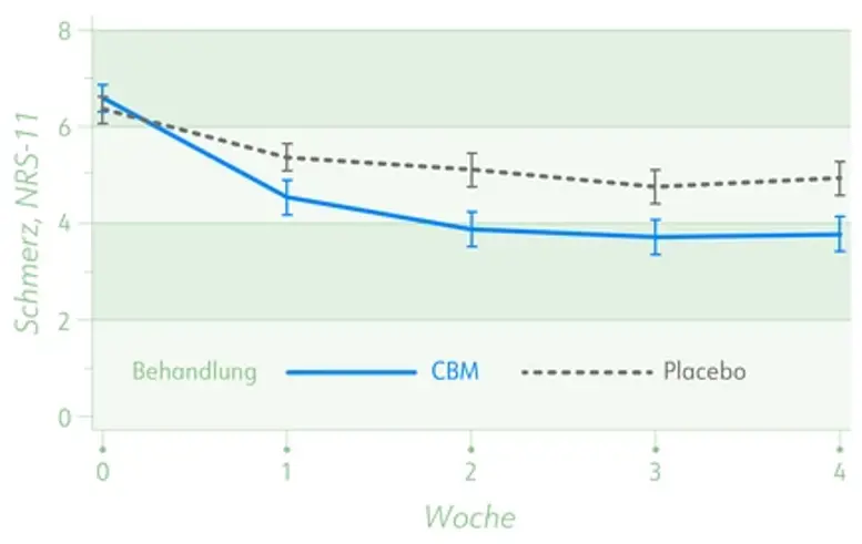 Mittlere Schmerzintensität auf einer numerischen Schmerzskala (0-11, ± SEM) für die Behandlung mit Cannabis-basierter Medizin (CBM) und Placebo.