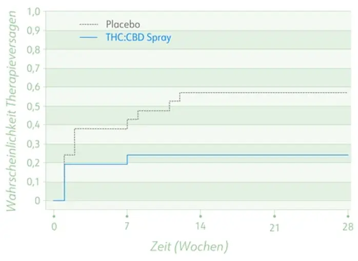 - Signifikant geringere Wahrscheinlichkeit des Therapieversagens nach Absetzen in Phase B unter THC:CBD-Extrakt vs. Placebo (24 % vs. 57 %; p = 0,04, s. Abb.)