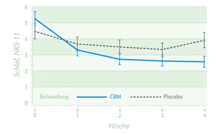 - Signifikante Verbesserung von Schlafstörungen im Vergleich zu Placebo (-2,5 vs. -0,8; p = 0,003)