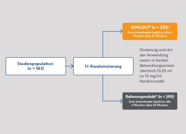 XIMLUCI® ist ein Ranibizumab-Biosimilar.2 Die Wirksamkeit, das Sicherheits- und Immunogenitätsprofil von XIMLUCI® im Vergleich zum Referenzprodukt* wurden im Rahmen der XPLORE-Studie untersucht – einer multizentrischen, randomisierten Phase-III-Studie, in die 582 Patienten mit nAMD eingeschlossen wurden. Die hohe Ähnlichkeit von XIMLUCI® zum Referenzarzneimittel konnte in Bezug auf Wirksamkeit, Sicherheits- und Immunogenitätsprofil sowie Pharmakokinetik nachgewiesen werden. Erfahren Sie auf dieser Seite mehr über die XPLORE-Studie und deren Studienergebnisse.1
