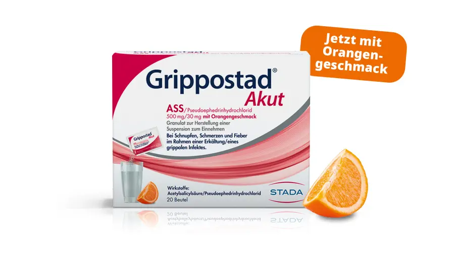 Einfacher geht’s nicht, denn dieses Grippostad® Akut zum Auflösen ist auch in kaltem Wasser löslich. Und schmeckt dazu angenehm nach Orange.