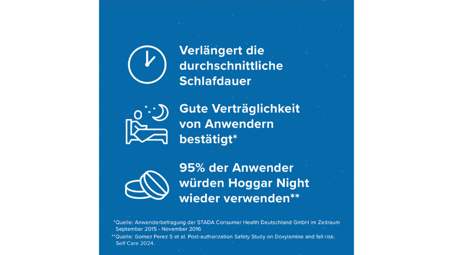 Wie bei allen Arzneimitteln können auch bei Hoggar® Night Nebenwirkungen auftreten. Bei dem Schlafmittel mit Doxylamin kann es selten bis sehr selten zu Erkrankungen des Blutes und des Lymphsystems, des Nervensystems oder des Magen-Darm-Trakts kommen. Weitere Informationen dazu entnehmen Sie bitte der Gebrauchsinformation. Im Gegensatz zu anderen Schlafmitteln macht der Wirkstoff Doxylamin nicht körperlich abhängig. Bei Fragen dazu wenden Sie sich an Ihren behandelnden Arzt.