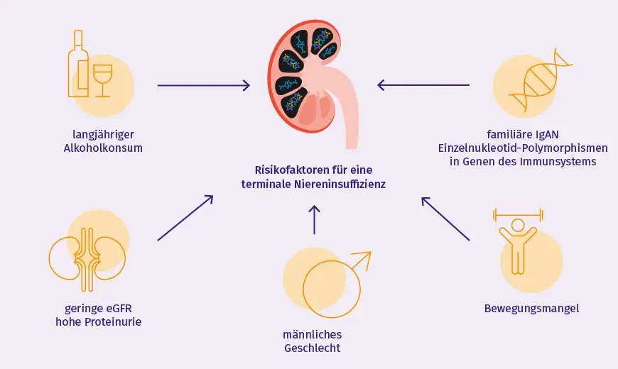 Verschiedene genetische und umweltbedingte Faktoren erhöhen das Risiko, dass die IgA-Nephropathie fortschreitet und sich schließlich als terminale Niereninsuffizienz manifestiert. So wurden beispielsweise (erhöhter) Alkoholkonsum in der Vergangenheit und ein Mangel an körperlicher Bewegung als unabhängige Risikofaktoren für die Entwicklung einer terminalen Niereninsuffizienz ermittelt. Darüber hinaus gehen eine niedrige eGFR (geschätzte glomeruläre Filtrationsrate) und eine hohe Proteinurie bei Betroffenen mit IgAN zum Zeitpunkt der Biopsie ebenfalls mit einem höheren Risiko für ein endgültiges Nierenversagen einher.