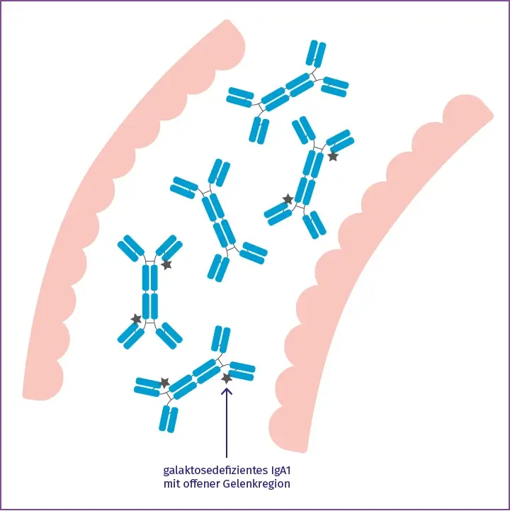 Bei der pathophysiologischen Entstehung der IgA-Nephropathie scheint vor allem IgA1, das in den Peyer-Plaques der Dünndarmschleimhaut gebildet wird, eine wichtige Rolle zu spielen. Diese spezielle Isoform des IgA1-Antikörpers unterscheidet sich jedoch strukturell von dem, das im Serum zirkuliert, denn es zeichnet sich durch einen Mangel an Galaktoseresten in der Gelenkregion aus und wird deshalb auch als galaktosedefizientes IgA1 bezeichnet (gd-IgA1).3, 4