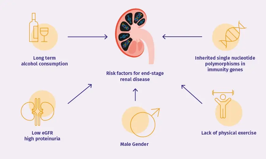 There are various genetic- and environmental related risk factors that increase progression of IgA Nephropathy until it finally manifests as end-stage renal disease. For example, a history of (excessive) alcohol consumption and lack of physical exercise have been identified as independent risk factors for the development of end-stage renal disease. In addition, low estimated glomerular filtration rate (eGFR) and a high level of proteinuria in those with IgAN at time of biopsy are also associated with an increased risk of end-stage renal disease.