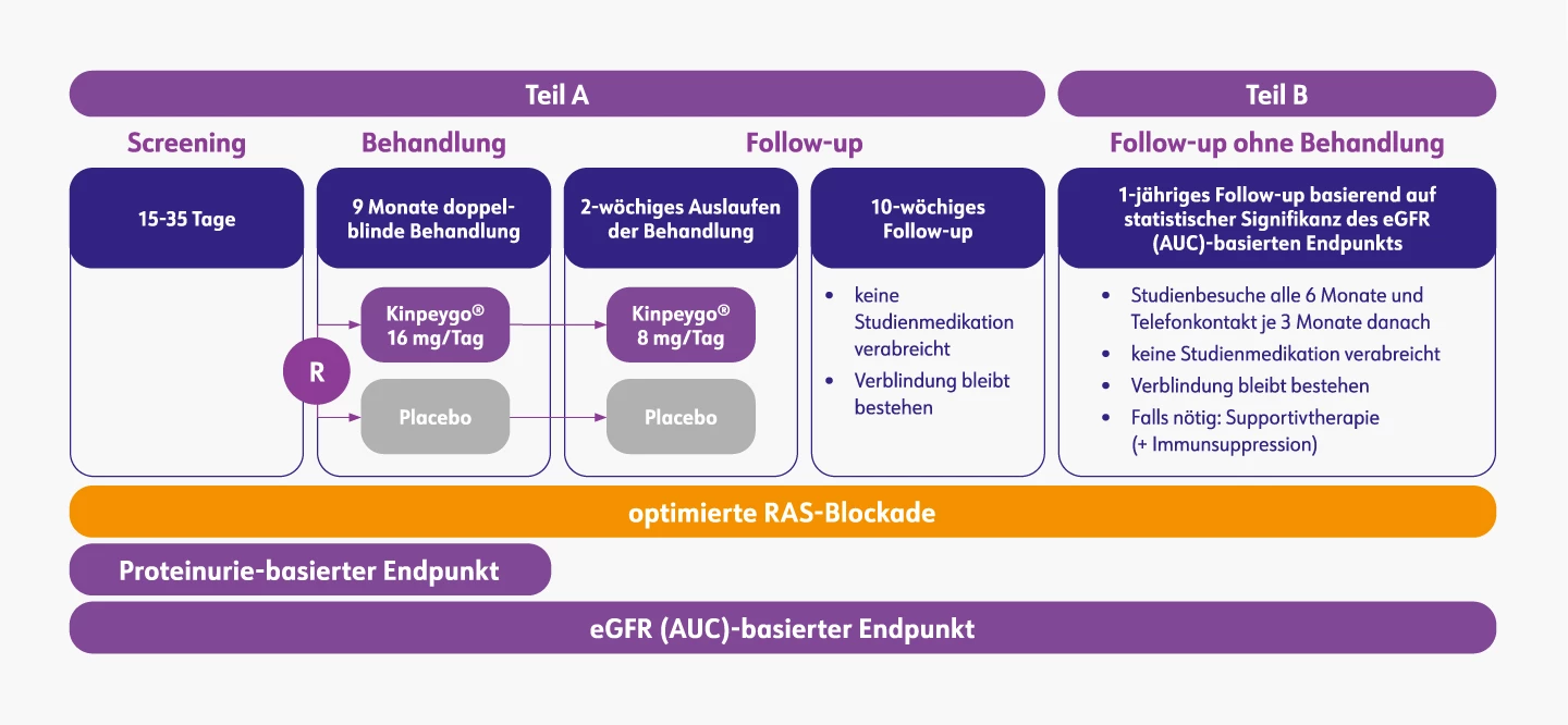 Die multizentrische, randomisierte, doppelblinde, Placebo-kontrollierte Phase-III-Studie NefIgArd ist eine zulassungsrelevante Studie, in der die Wirksamkeit und Sicherheit von Kinpeygo® im Vergleich zu Placebo bei erwachsenen Patienten mit durch Biopsie nachgewiesener IgAN unter stabiler RAS-Blockade untersucht wurde.2