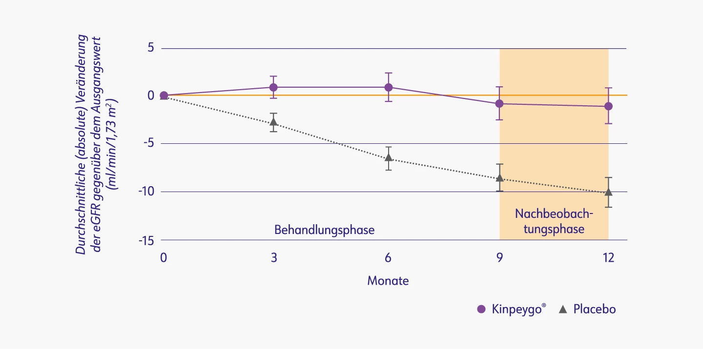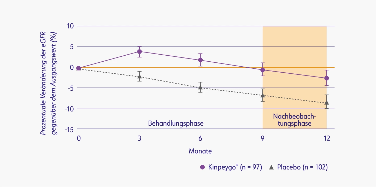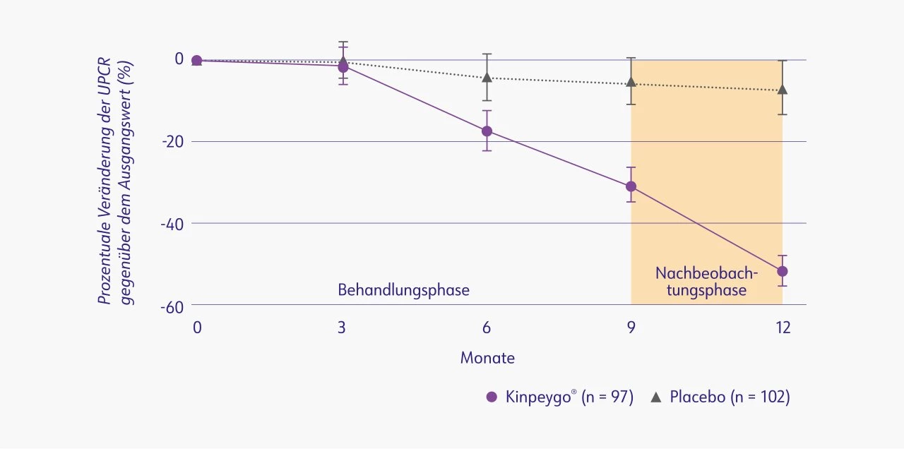 In der Phase-III-Studie zeigte Kinpeygo® (16 mg pro Tag) seine Wirksamkeit am primären Endpunkt (24-Stunden-UPCR nach 9 Monaten im Vergleich zur Baseline). Die durchschnittliche UPCR-Reduktion betrug 31 % in der Patientengruppe mit Kinpeygo® und 5 % in der Placebo-Gruppe.2 Der Behandlungseffekt in Bezug auf die UPCR-Reduktion wurde als prozentuale Veränderung im Vergleich zu Placebo ausgedrückt und war nach 9 Monaten mit 27 % (p=0,0003) statistisch signifikant. Dieser verstärkte sich in der Nachbeobachtungsphase zusätzlich und betrug nach 12 Monaten sogar 48 % im Vergleich zu Placebo (p < 0,0001).2