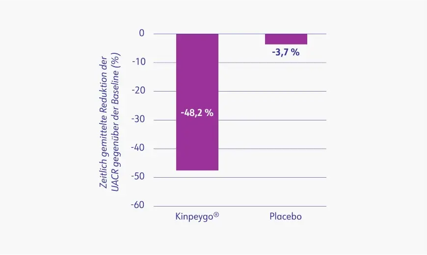 Der Effekt von Kinpeygo® auf die UACR war ähnlich zu den UPCR-Beobachtungen. Die zeitlich gemittelte UACR-Reduktion betrug 48,2 % in der Kinpeygo®-Gruppe und 3,7 % in der Placebo-Gruppe (p < 0,0001).3