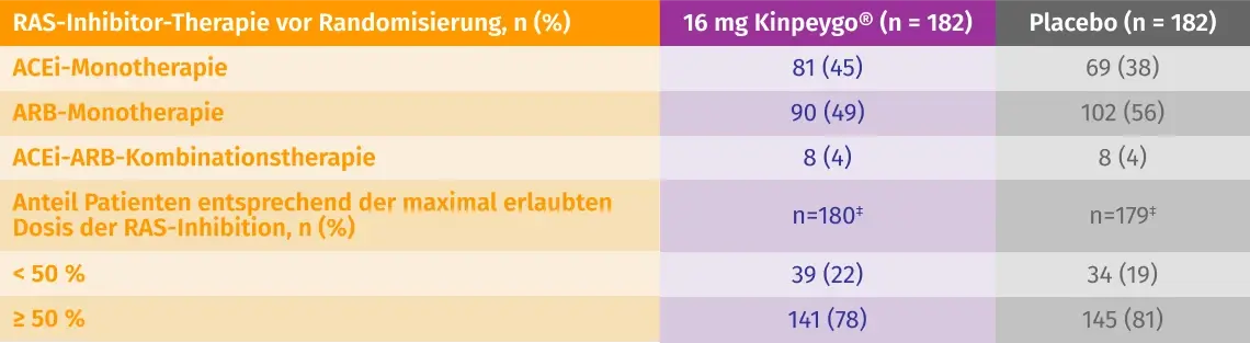 RAS: Renin-Angiotensin-System; ACEi: angiotensin-converting enzyme inhibitor (Angiotensinkonversionsenzym-Inhibitor); ARB: angiotensin receptor blocker (Angiotensin-Rezeptor-Blocker). ‡ n ist die Anzahl der Patienten, für die die Daten zur maximal zulässigen Dosis vorlagen; der Grad der RAS-Inhibition fehlt für Patienten, für deren Therapie keine maximal zulässige Dosis verfügbar war. Bei Patienten, die sowohl einen ACEi als auch einen ARB einnahmen, wurde die Summe der prozentualen Anteile der zulässigen Höchstdosis für beide zusammengefasst.