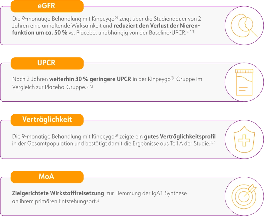 Der 2-Jahres-Behandlungseffekt auf die eGFR wurde auch in der zulassungsrelevanten Subgruppe, die nur aus Patienten mit ausgeprägter Proteinurie (UPCR ≥ 1,5 g/Gramm) bestand, beobachtet. In dieser Gruppe verlangsamte Kinpeygo® ebenfalls die Progression der IgAN über die Follow-up-Zeit.3