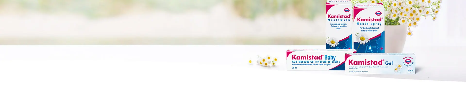 Kamistad® is a proven specialist for pain and inflammation in the oral cavity – with the unique 2-fold combinations with natural chamomile. Kamistad® Baby Gel helps with the teething pain of the youngest, while in case of friction and pain caused by fixed braces or problems with the dentures, the chamomile-strong Kamistad® Gel relieves the pain and promotes healing. And with the new Kamistad® oral spray, even hard-to-reach areas in the oral cavity can be easily cared for with chamomile – especially with stressed or aphthae-prone oral mucosa!