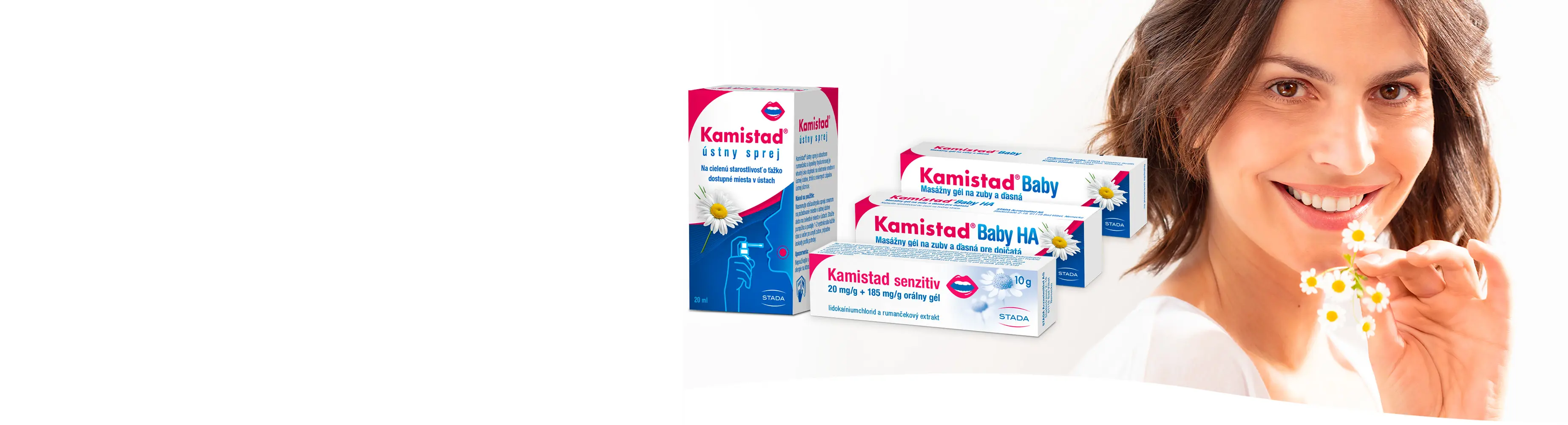 Značka Kamistad® je osvedčeným špecialistom na bolesť a zápal v ústnej dutine – s unikátnou kombináciou účinných látok vrátane prírodného rumančeka. Na bolesť spôsobenú prerezávajúcimi sa zubmi u najmenších pomáha masážny gél Kamistad® Baby, zatiaľ čo v prípade nepríjemného trenia a bolesti vyvolanej pevným strojčekom alebo problémami so zubnou protézou zase poslúži Kamistad® Senzitiv, ktorý výrazne uľaví od bolesti a podporí hojenie.