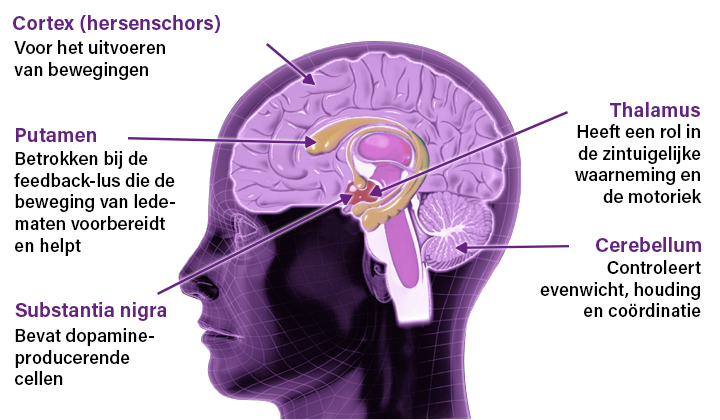 Bij de ziekte van Parkinson is er een tekort aan dopamine door het afsterven van zenuwcellen in een bepaald deel van de hersenen (substantia nigra).