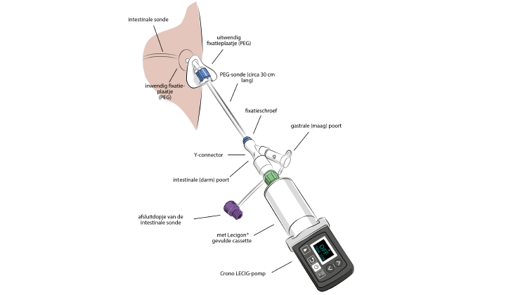 Lecigon wordt gebruikt als de ziekte van Parkinson gevorderd is en als medicijnen die via de mond (oraal) worden ingenomen niet langer optimaal werken of gewenst resultaat. Lecigon is een gel, bestaande uit levodopa, carbidopa en entacapon. Dit zijn (deels) dezelfde werkzame stoffen als in uw tabletten, alleen worden ze op een andere manier toegediend. Dit betekent dat levodopa, carbidopa en entacapon in vloeibare vorm direct in de dunne darm worden afgegeven via een sonde (slangetje) die door de buikwand en door de maag gaat en eindigt in de dunne darm. Deze sonde wordt een PEG-J genoemd. Omdat bij deze behandeling Lecigon direct in de darm komt, zijn er minder problemen met de opname in het bloed. Bovendien is er een continue afgifte via de pomp, waardoor er minder schommelingen zullen plaatsvinden van dopamine in de hersenen. Dit zorgt mogelijk voor minder ON- en OFF-momenten.