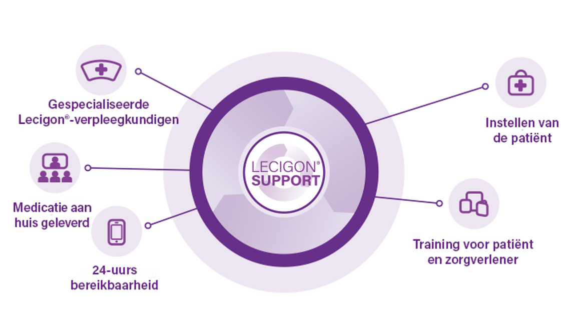 Om optimaal ondersteund te worden bij het juiste gebruik van Lecigon en de Crono LECIG-pomp, kunt u gebruik maken van LecigonSupport. Dit is een zorgprogramma dat u ondersteunt in zowel het ziekenhuis als in uw thuissituatie met een 24-uursservice en de inzet van speciaal opgeleide Lecigonverpleegkundigen.