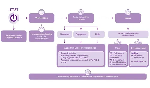 Centrafarm werkt samen met Eurocept Homecare om een compleet pakket van zorg te bieden aan patiënten die Lecigon krijgen. Gespecialiseerde Lecigonverpleegkundigen zijn 24 uur per dag bereikbaar om zorgverleners, patiënten (en naasten die zorg verlenen) te ondersteunen. De Lecigonverpleegkundigen kunnen eveneens aanwezig zijn bij het plaatsen van de PEG-J, het testen en instellen van Lecigon en de nazorg. Lecigon wordt geleverd met de speciaal ontworpen Crono LECIG-pomp, sondes, draagmaterialen en informatiemateriaal voor zorgteams en patiënten.