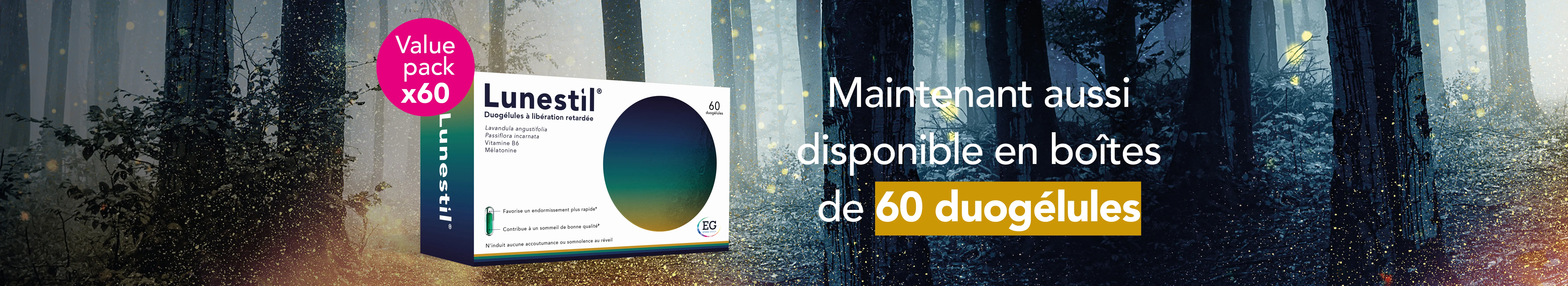 Lunestil offre une solution innovante et unique pour une bonne nuit de sommeil*. Grâce à l’association unique d’ingrédients puissants réunis dans une duogélule unique à technologie à double action, Lunestil favorise le sommeil pour un réveil frais et dispos le matin*.