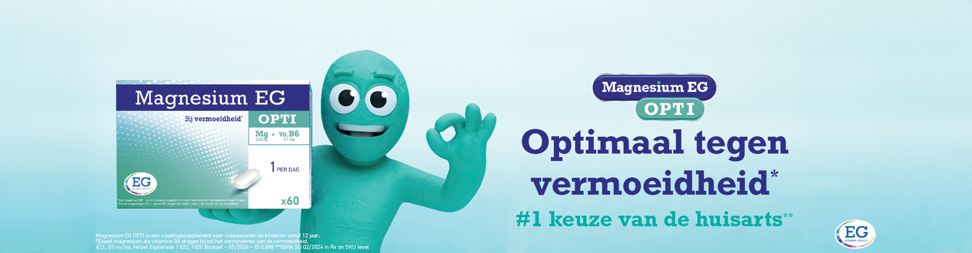 *IQVIA SO of magnesium filtered on reference level 08/2023 Magnesium EG OPTI is een voedingssupplement voor volwassenen en kinderen vanaf 12 jaar. **Zowel magnesium als vitamine B6 dragen bij tot een normale psychologische functie en tot het verminderen van de vermoeidheid. Magnesium draagt bij tot een normaal energieleverend metabolisme en een normale functie van het zenuwstelsel. Magnesium draagt bij tot een normale werking van de spieren.