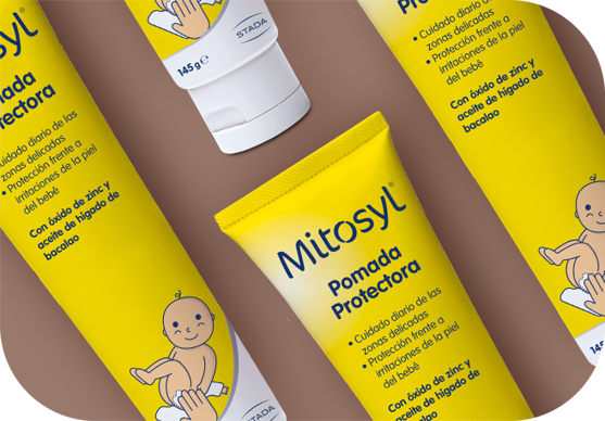 - El siguiente paso consiste en aplicar sobre la piel limpia lo que tiene que convertirse en una efectiva barrera de protección frente a las citadas sustancias irritantes. Nos referimos a una pomada específica para la dermatitis del pañal como Mitosyl Pomada Protectora que, por su formulación suave con óxido de zinc y aceite de hígado de bacalao, ayuda a prevenir la irritación y el enrojecimiento en la zona del pañal.