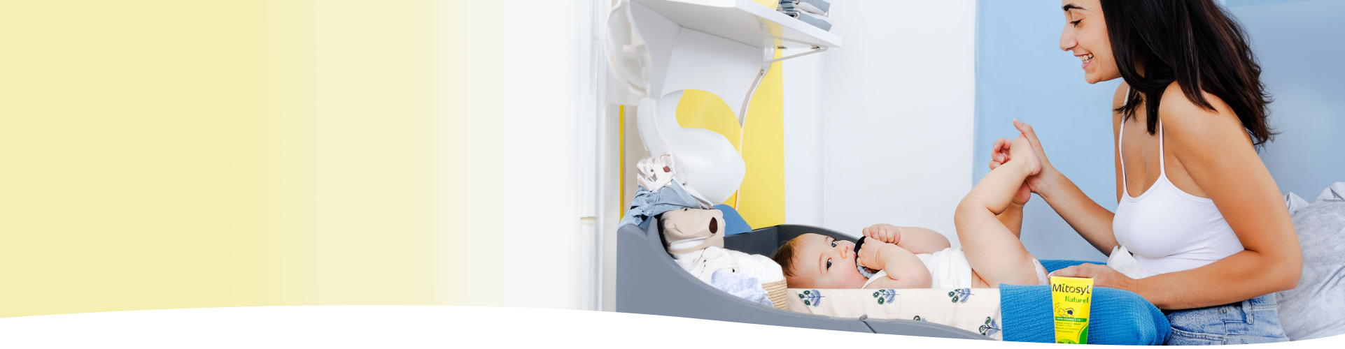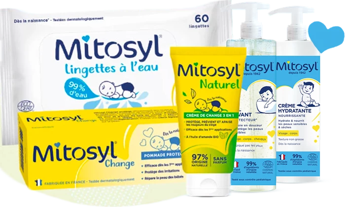 Mitosyl®, l'indispensable dans la trousse de soin des bébés ! Les produits Mitosyl peuvent être utilisés dès la naissance* et sont testés dermatologiquement ou sous contrôle pédiatrique. Ils sont spécialement formulés pour protéger et apaiser la peau des bébés.