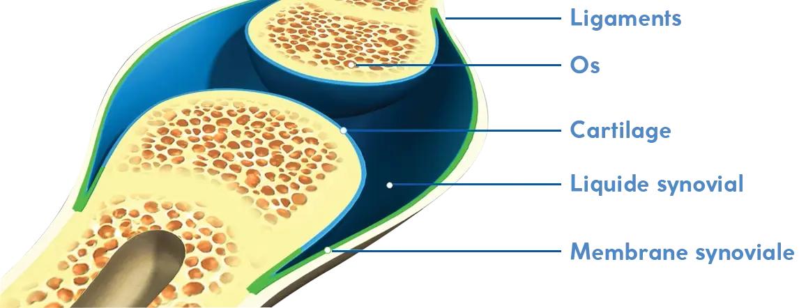 Dans la cavité articulaire se trouve la membrane synoviale, cette membrane assure la production du liquide synovial: un liquide lubrifiant qui assure que les surfaces lisses du cartilage glissent correctement l’une contre l’autre.
