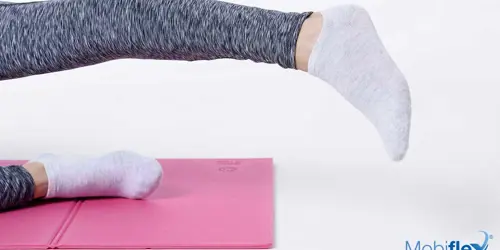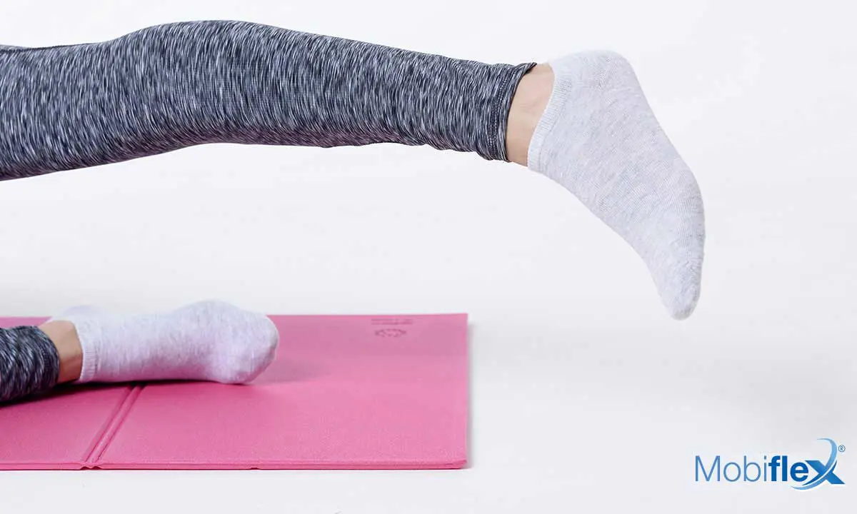 En contractant les abdominaux, montez la jambe gauche à l’horizontale en tournant la pointe du pied vers le sol.