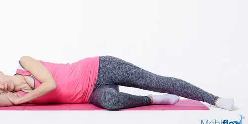 Couché au sol en appui sur le flanc droit, le bras droit plié sous la tête et le bras gauche en appui au sol pour maintenir l’équilibre, le regard à l'horizontal, la jambe droite pliée à 90° (elle forme un angle droit avec le tronc au sol) et la jambe gauche tendue, le pied droit reposant au sol.