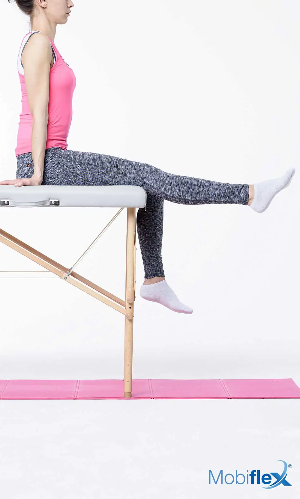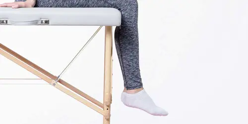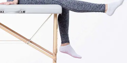 Assis sur une table, le dos bien droit, le regard à l'horizontal, les bras le long du corps, les mains en appui sur la table, le creux du genou (l'arrière du genou) placé au bord de la table, les jambes relâchées vers le sol.